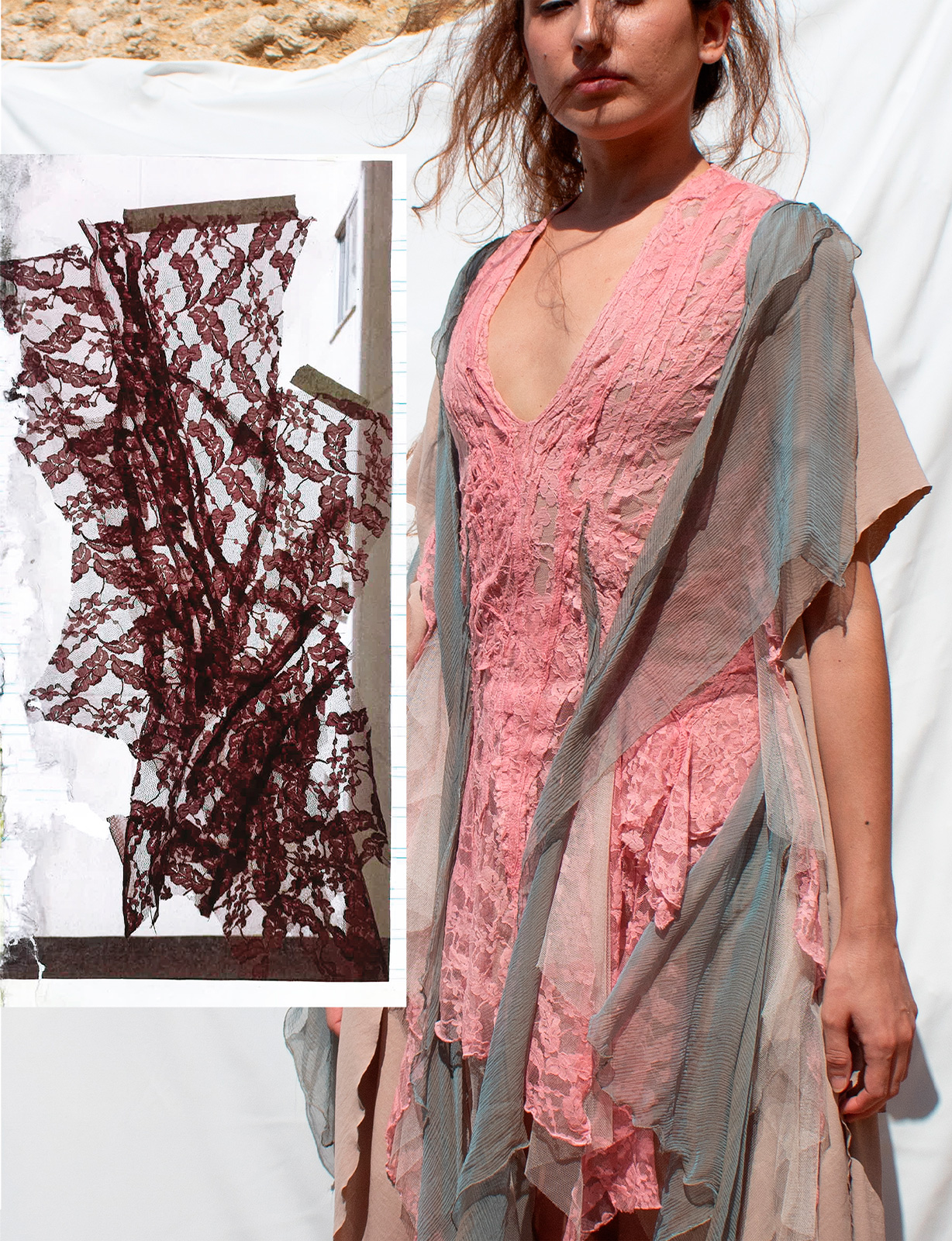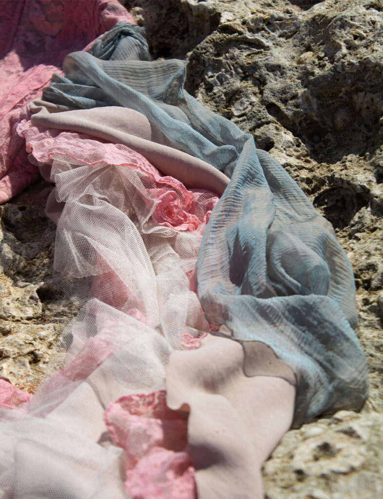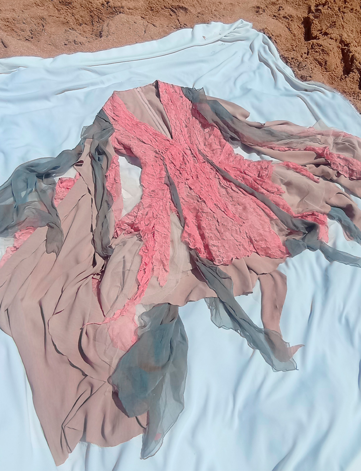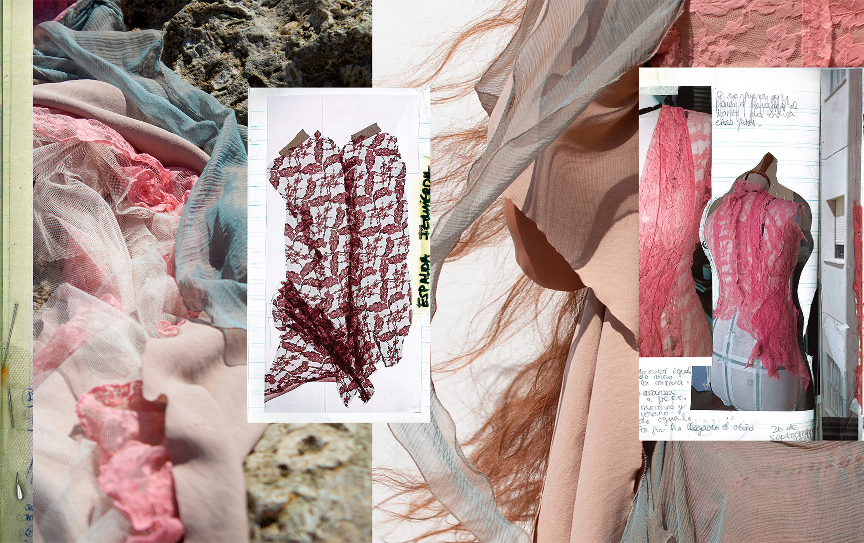 El uso de encaje de nylon y seda tornasolada permitió recrear las texturas y caídas deseadas desde el inicio del proyecto. Aunque partió de un boceto previo, Mer Dress se desarrolló a través de la evolución y la experimentación, trabajando el tejido con tintes y frunces para alcanzar un resultado más orgánico y enigmático.