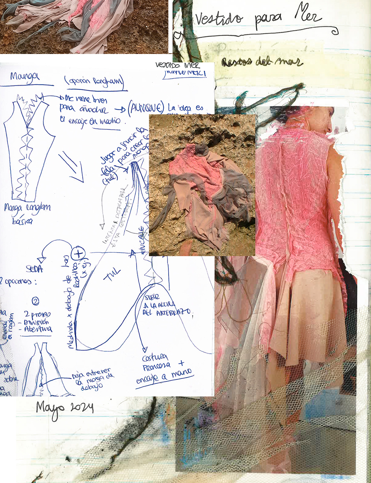 Mer Dress fue creado con la intención de plasmar el fuerte imaginario estético de la clienta, inspirado en el paisaje oceánico. Bajo el concepto de lo que el mar arrastra, la pieza busca evocar las luces y vestigios que el mar nos ofrece.